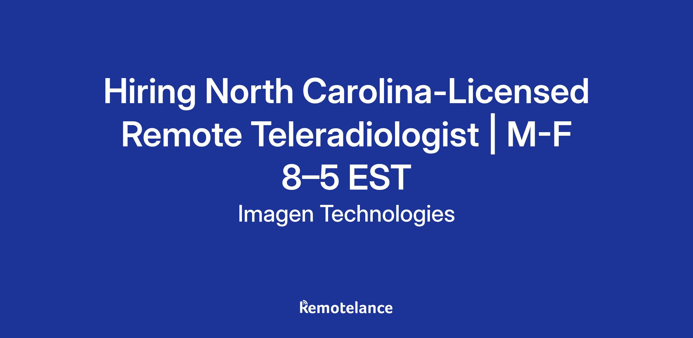 Imagen Technologies is expanding our team by adding world-class, North Carolina-licensed, general Teleradiologists to join on a full-time, remote basis to interpret X-ray, ultrasound, MRI, and CT studies from the comfort of your own home on a daytime schedule. Imagen provides a highly competitive salary, ten weeks of vacation, and excellent benefits. Our ideal candidate is collegial, dependable, and collaborative. Our physician team has comprehensive support from radiology assistants and IT staff to streamline and optimize workflows. Reach out if you want to join a fantastic team!